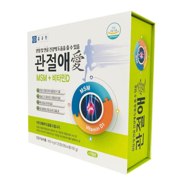 | 원재료명 및 함량 | MSM 1,500mg / 비타민D 10ug | 영양정보 | MSM, 비타민D, 기타(해조칼슘,글루코사민황산염분말,보스웰리아추출분말) |