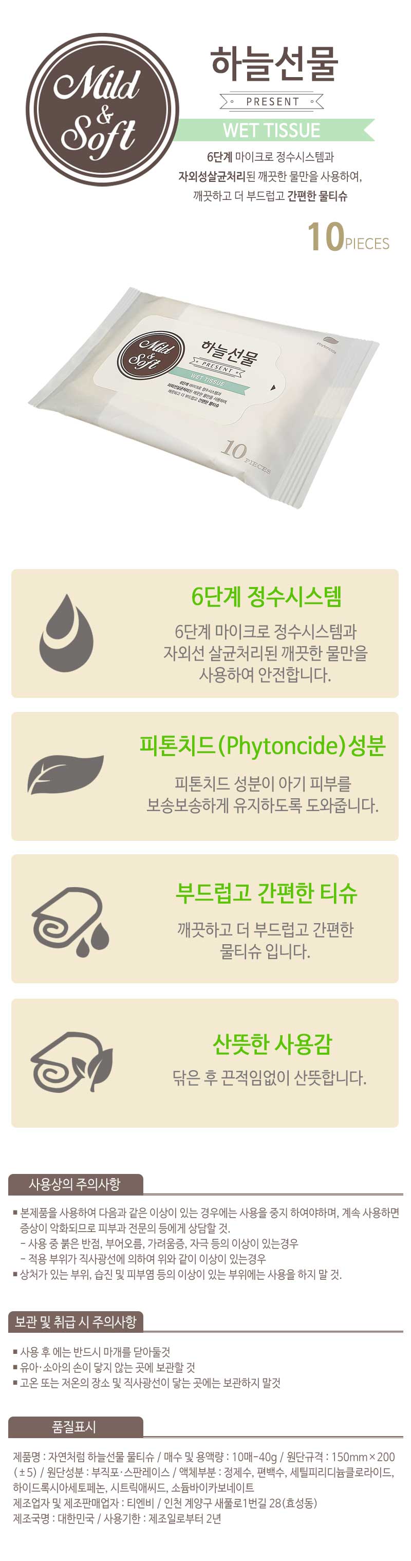 | 상품군 | 기타 | 품명 및 모델명 | 피톤치드 저자극 하늘선물 휴대용 물티슈 |