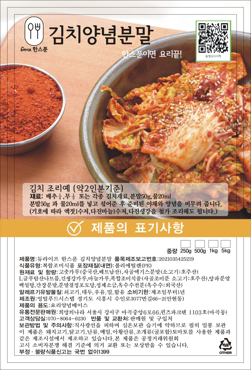 | 모델명 | 듀라이프 한스푼 김치양념분말 250g |