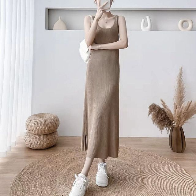 골지 슬림 민소매 나시원피스 롱 스퀘어넥 원피스