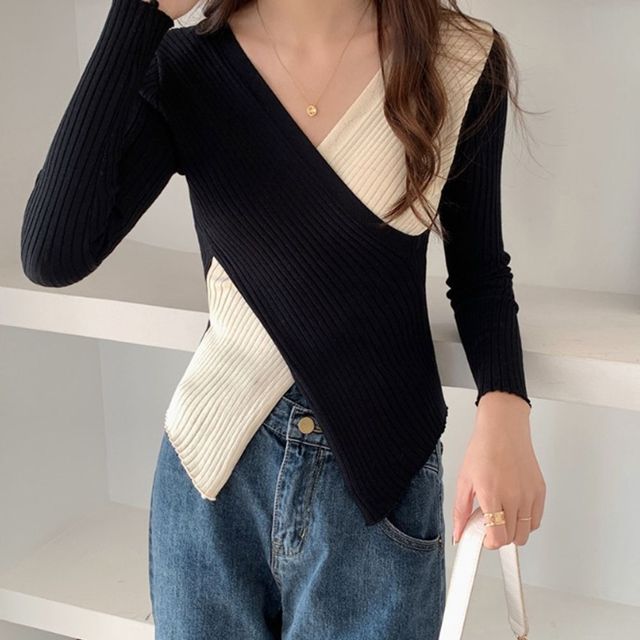 배색 여성 긴팔 티셔츠 브이넥 니트티 긴팔티 상의 긴팔티셔츠 여성티셔츠