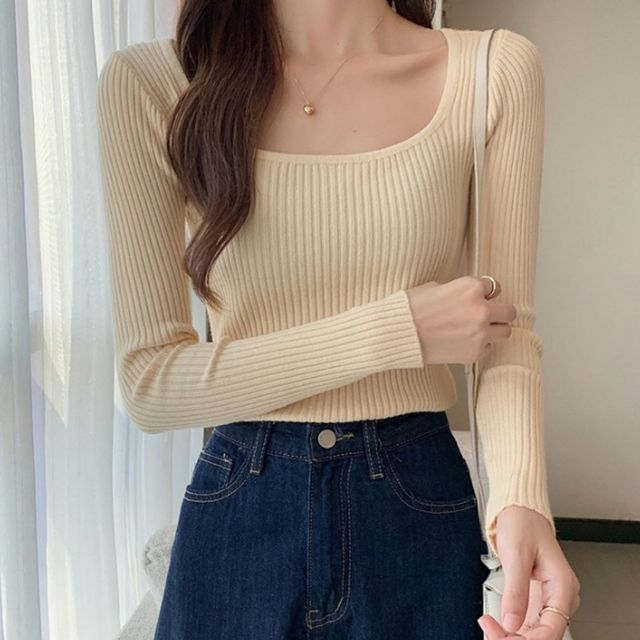 무지 여성 긴팔 티셔츠 U넥 골지니트 슬림핏 상의 긴팔티셔츠 여성티셔츠