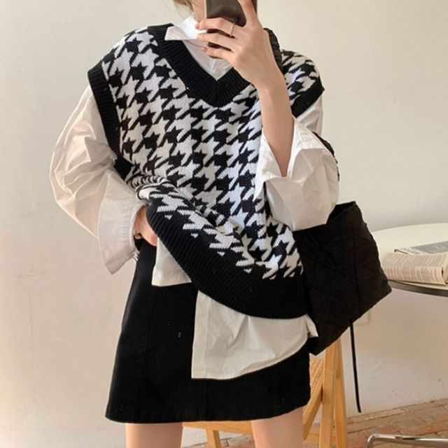 데일리 여성 니트 베스트 하운드 체크 여자 니트조끼 니트베스트