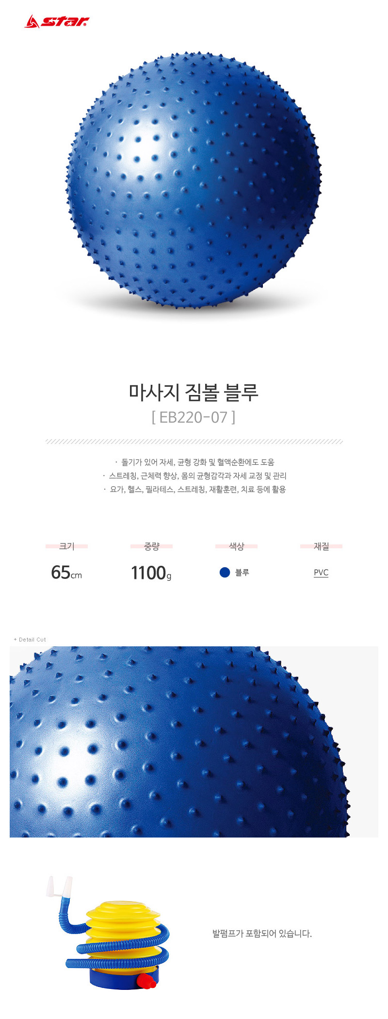 스타 - 마사지 짐볼 65cm + 펌프 블루 EB220-07/헬스/다이어트/공/볼/요가/다이어트용품/필라테스