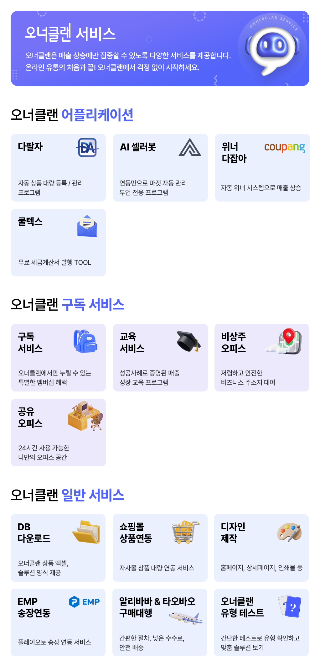 다팔자 셀러봇 다잡아 쿨텍스 구독 교육 비상주 공유오피스 DB다운로드 상품연동 디자인 제작 EMP 송장연동 구매대행 유형 테스트