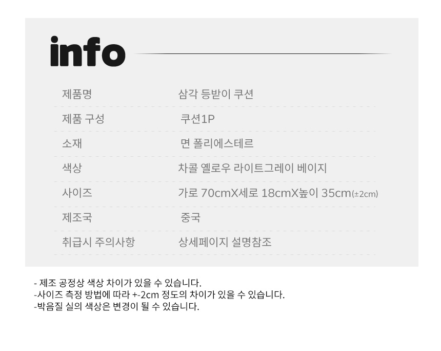 | 색상 | 다크그레이 옐로우 라이트그레이 베이지 | 치수 | 가로 70cm 세로18cm 높이 35cm |