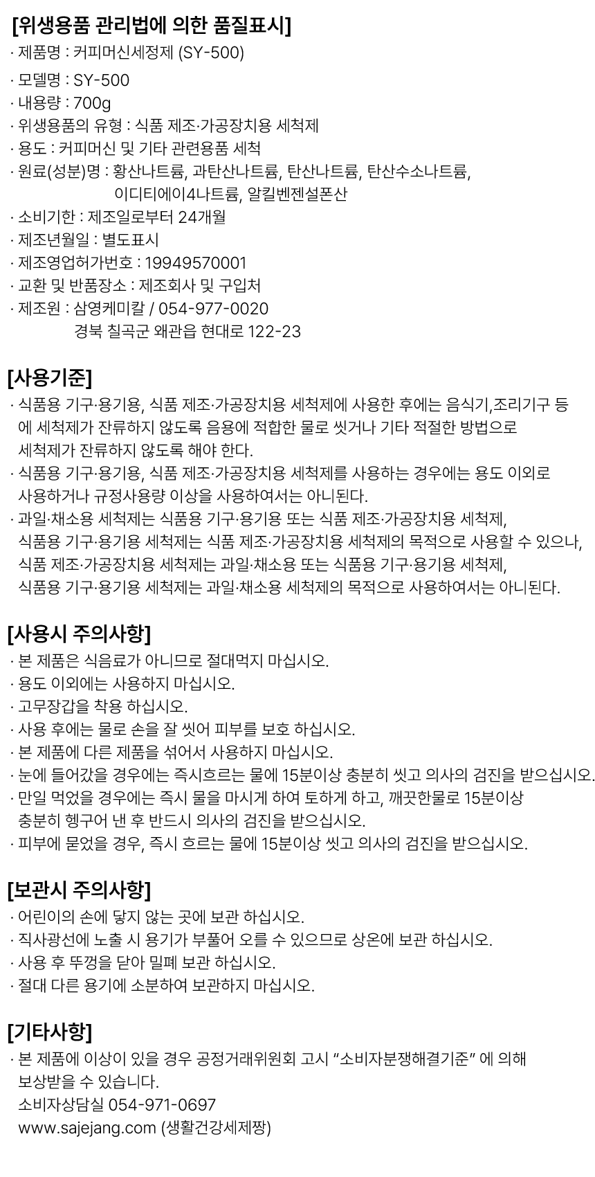 | 원산지 | 국내|경북|칠곡군 | 제조사/수입사 | 삼영케미칼 |